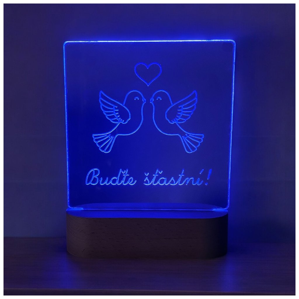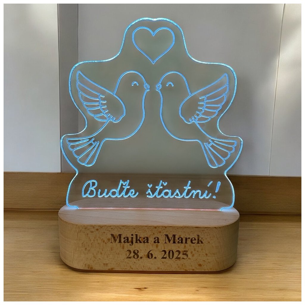 Jemná a elegantná LED lampa s obrázkom dvoch holubíc a nápisom „Buďte šťastní!“ je krásnym a originálnym darčekom pre novomanželov. Vďaka decentnému podsvieteniu vytvára príjemnú atmosféru a zároveň ostáva trvalou spomienkou na výnimočný deň.