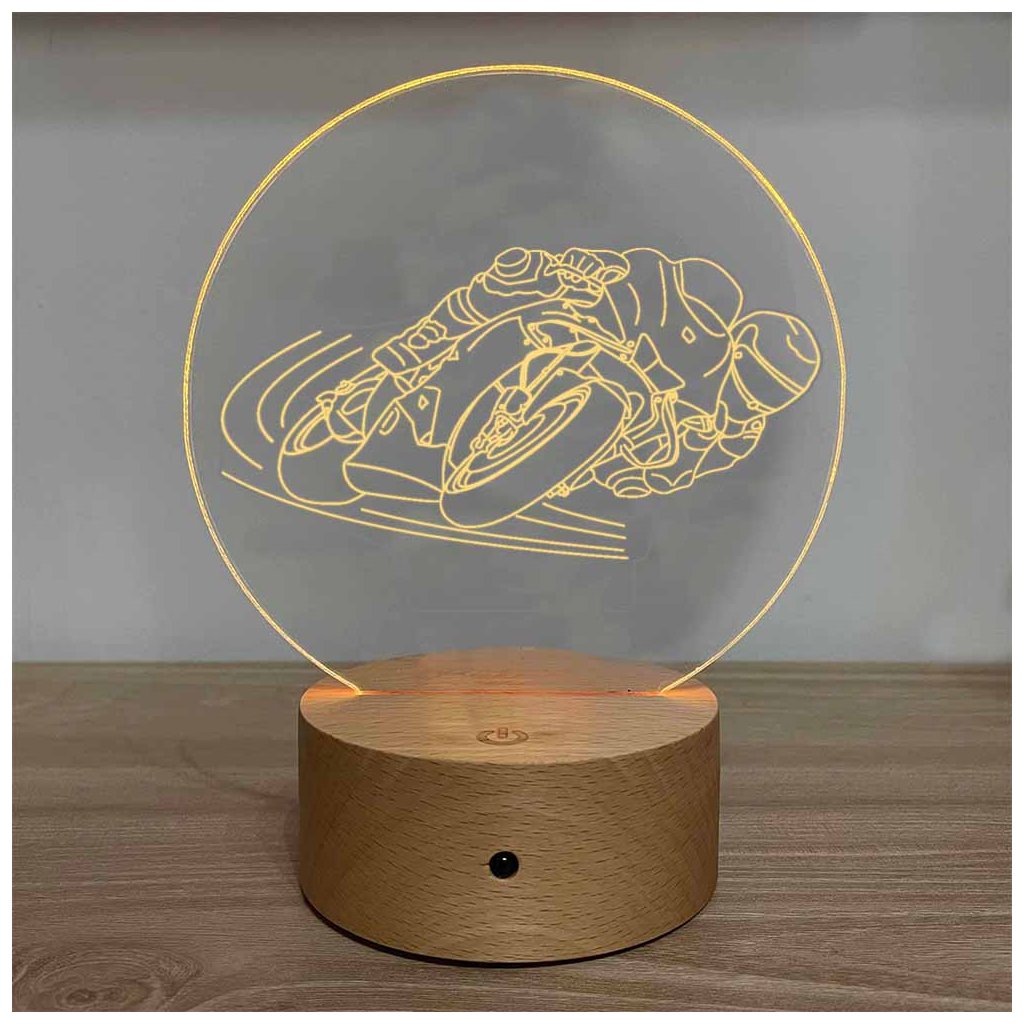 Táto LED lampa zobrazuje dynamický obrys pretekárskeho motocyklistu v náklone, zvýraznený jemným gravírovaním a teplým svetlom, ktoré dodáva motívu energiu a moderný štýl.