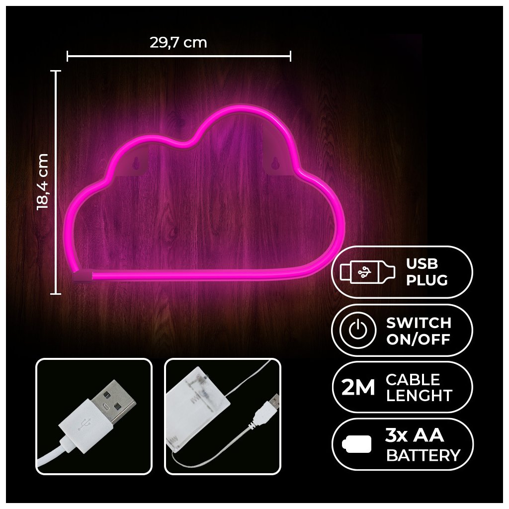Štýlový LED neón v tvare obláčika s jemným ružovým svetlom vytvorí príjemnú atmosféru v každej miestnosti. Ideálny na dekoráciu spální, detských izieb či kaviarní. Napájanie cez USB alebo batérie, jednoduchá montáž.