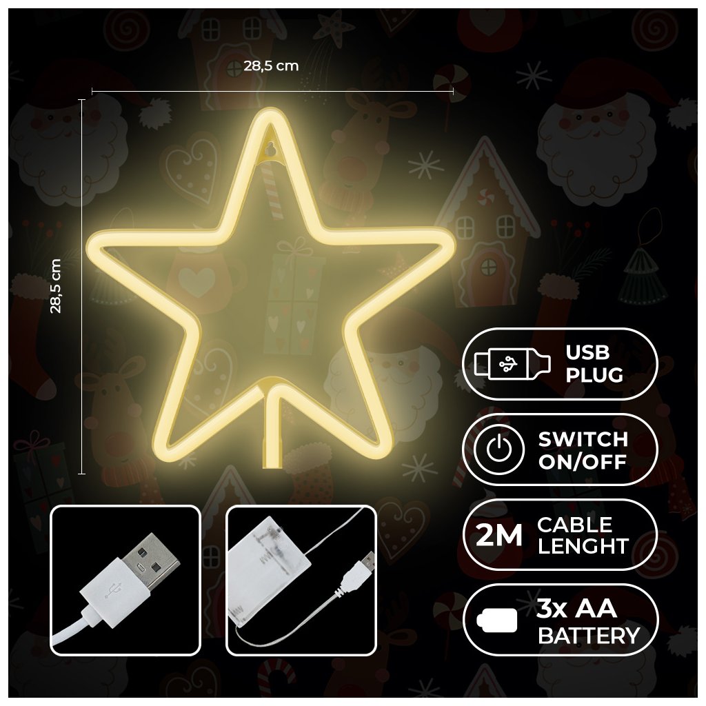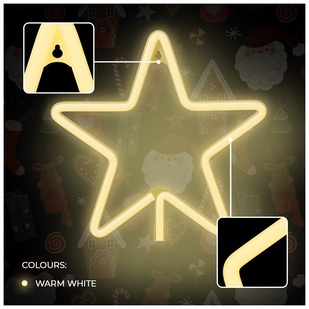 Dodajte svojmu priestoru jedinečnú atmosféru s týmto štýlovým LED neónovým svetlom v tvare vianočnej hviezdy. Jemné biele osvetlenie vytvára čarovný a príjemný vizuálny efekt, ktorý sa hodí do interiérov všetkých štýlov. Či už chcete skrášliť svoju spálňu, detskú izbu, obývačku alebo kaviareň, tento neónový dekor prinesie do priestoru útulnosť a čarovnosť.
