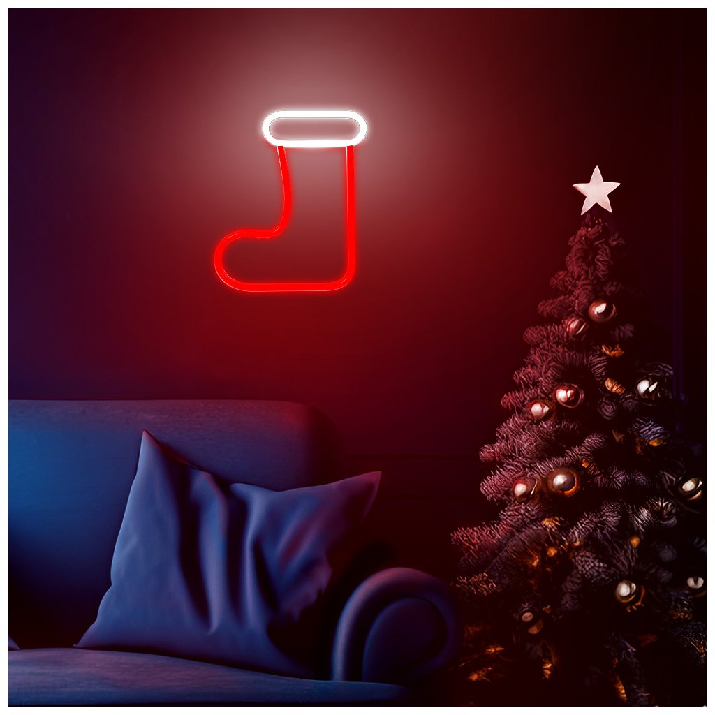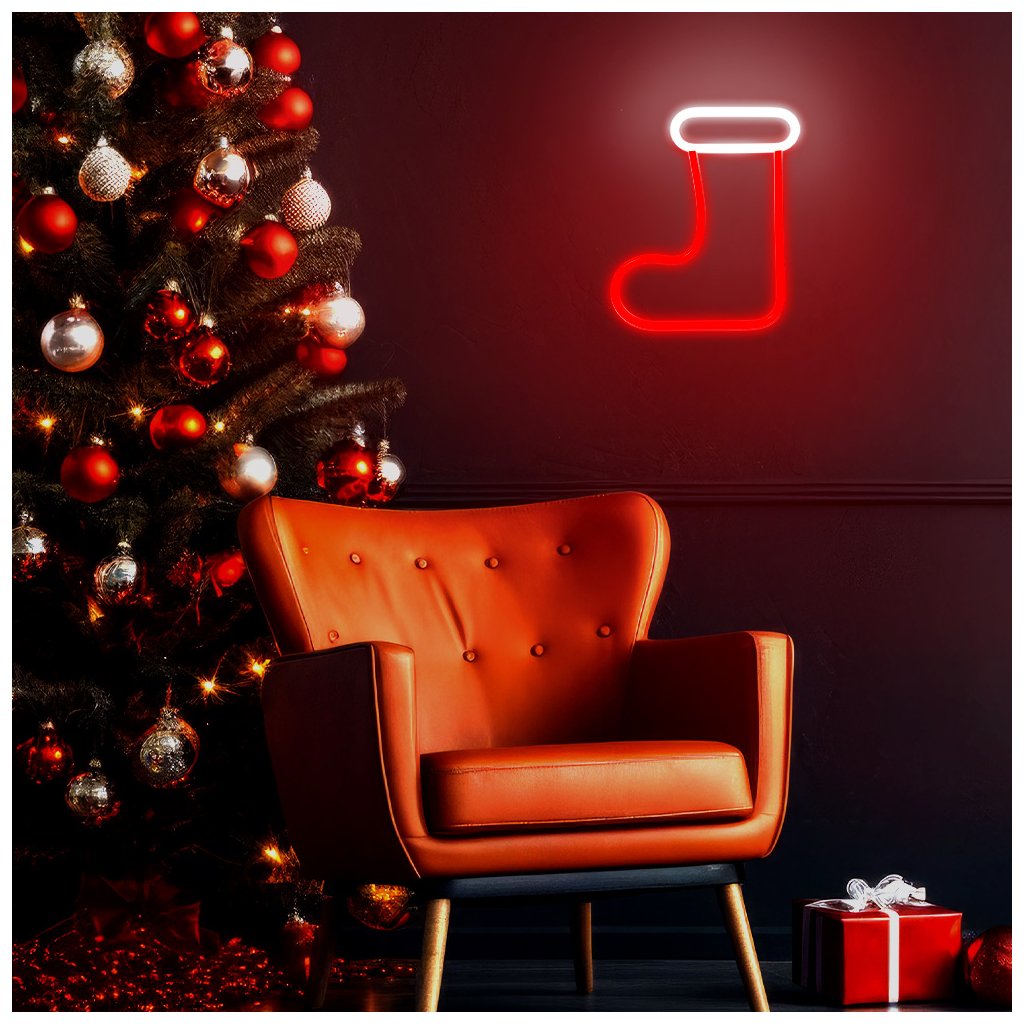 Dodajte svojmu priestoru jedinečnú atmosféru s týmto štýlovým LED neónovým svetlom v tvare vianočnej ponožky. Jemné červeno-biele osvetlenie vytvára čarovný a príjemný vizuálny efekt, ktorý sa hodí do interiérov všetkých štýlov. Či už chcete skrášliť svoju spálňu, detskú izbu, obývačku alebo kaviareň, tento neónový dekor prinesie do priestoru útulnosť a čarovnosť.