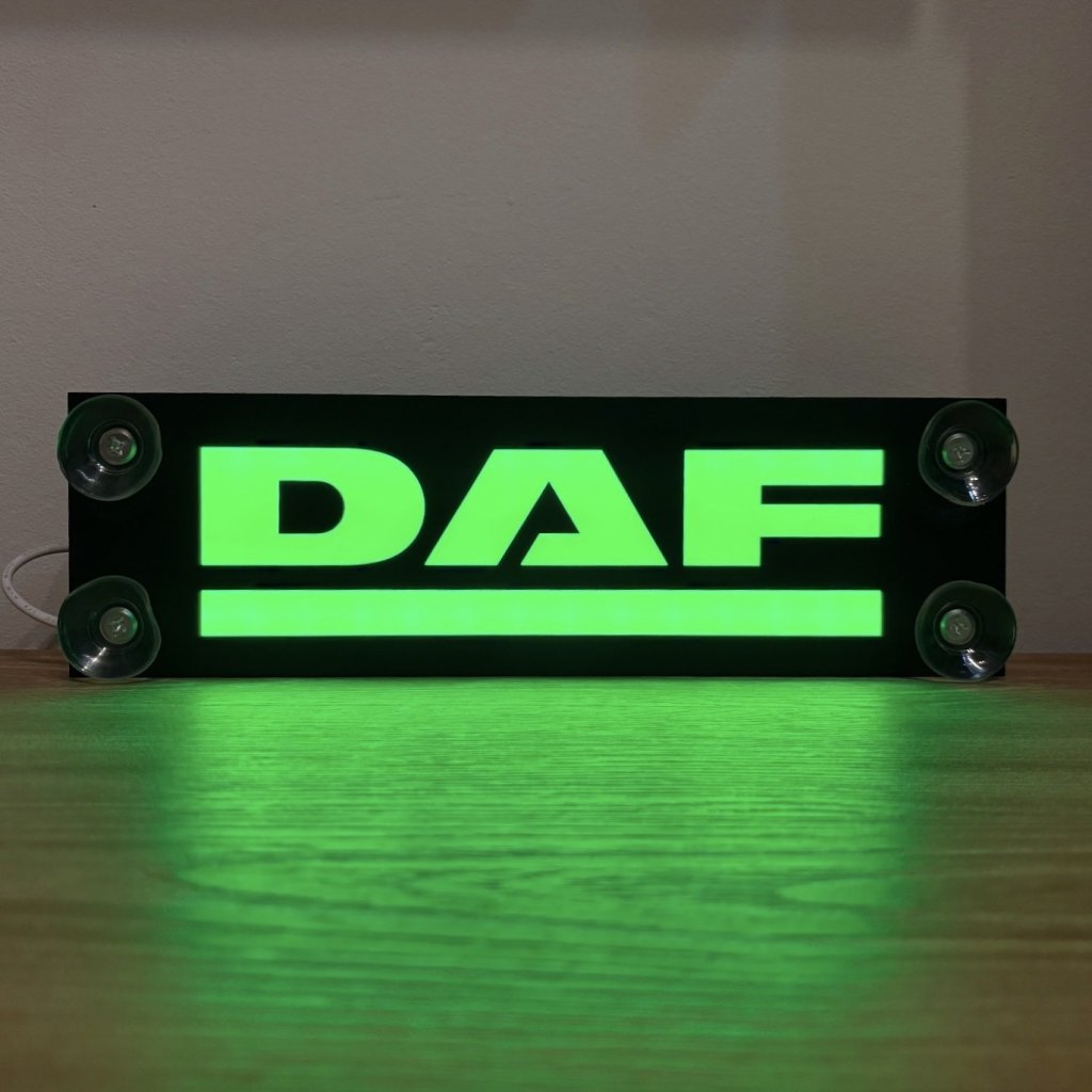 LED tabuľka DAF je štýlový doplnok do kabíny kamiónu. Vyrobená z akrylu s logom DAF a farebným LED podsvietením. Jednoduchá montáž pomocou prísaviek, napájanie cez USB. Perfektná dekorácia pre každého vodiča DAF!