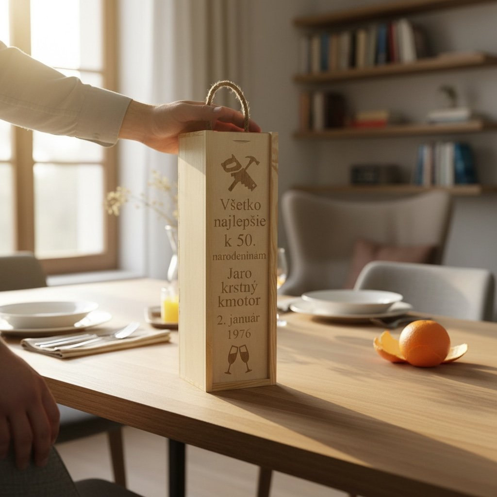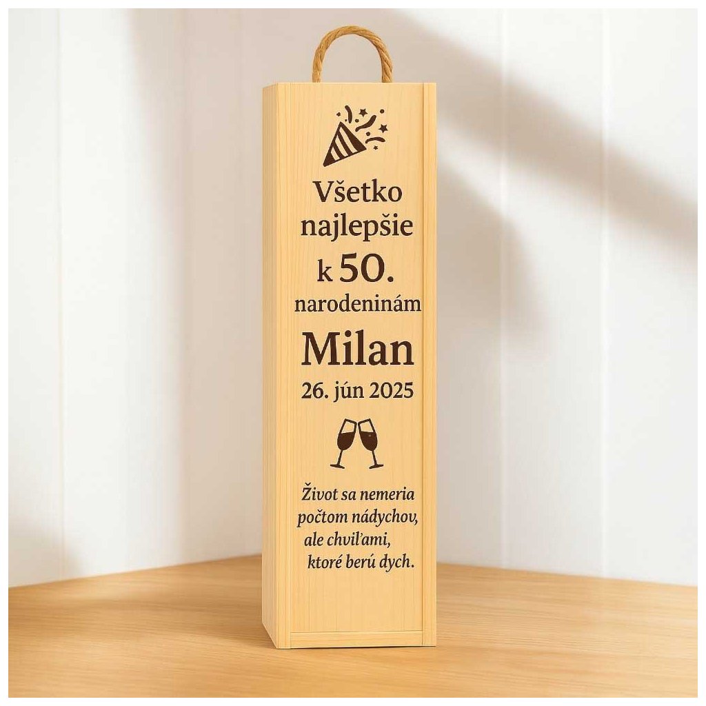 Tento štýlový drevený box s laserovým gravírovaním je ideálnym darčekom k narodeninám. Vyrobený z kvalitného svetlého dreva a vybavený praktickou šnúrkou na prenášanie, nielenže ochráni fľašu vína, ale zároveň odovzdá osobné a výnimočné venovanie.