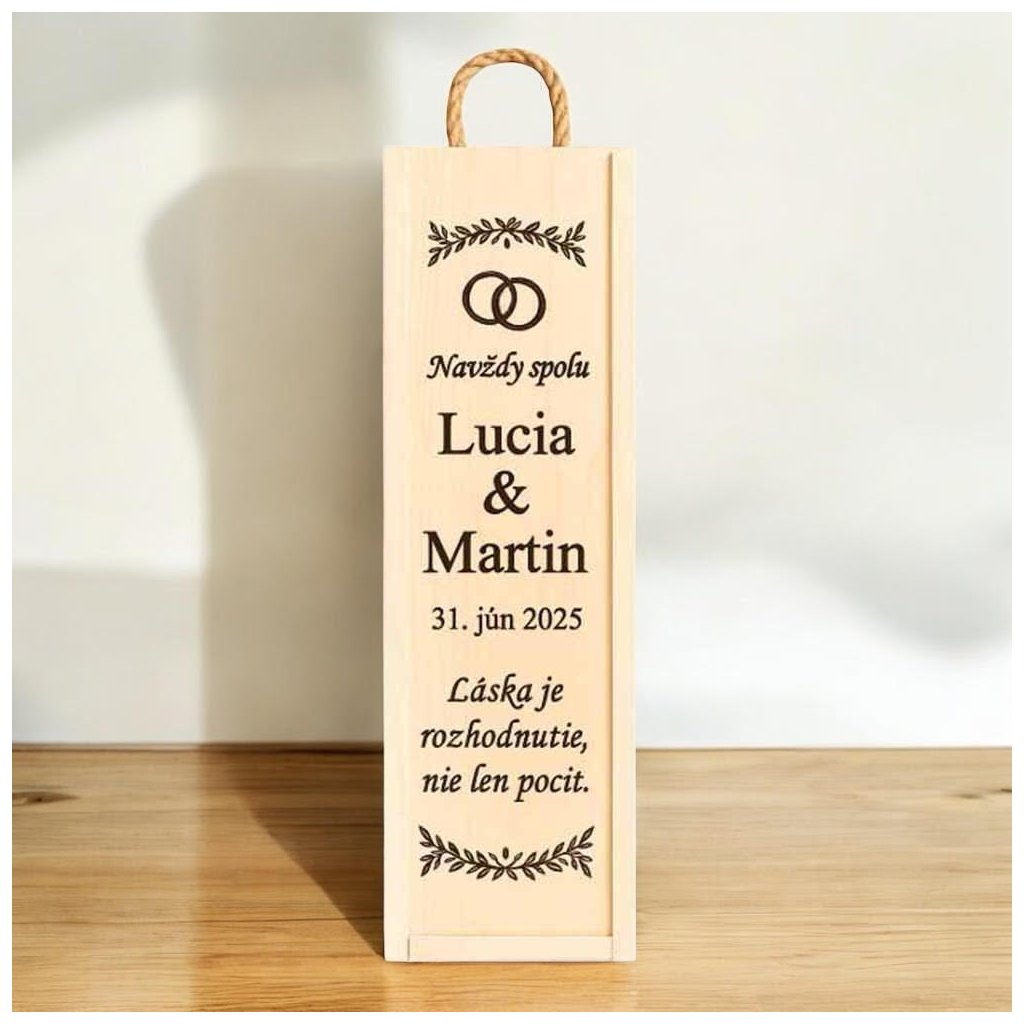 Elegantný drevený box na víno s laserovým gravírovaním je dokonalým darom pre svadobný deň alebo výročie. Vyrobená z kvalitného svetlého dreva, s praktickou šnúrkou na prenášanie, poskytuje nielen ochranu pre fľašu vína, ale aj krásny a osobný odkaz.